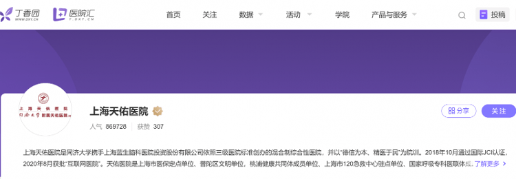 上海天佑医院成立于2015年3月10日,注册资本1000万元,法定代表人为徐国彤。根据丁香园、BOSS直聘等平台的信息,上海天佑医院是 “同济大学携手上海蓝生脑科医院投资股份有限公司依照三级医院标准创办的混合制综合性医院”。