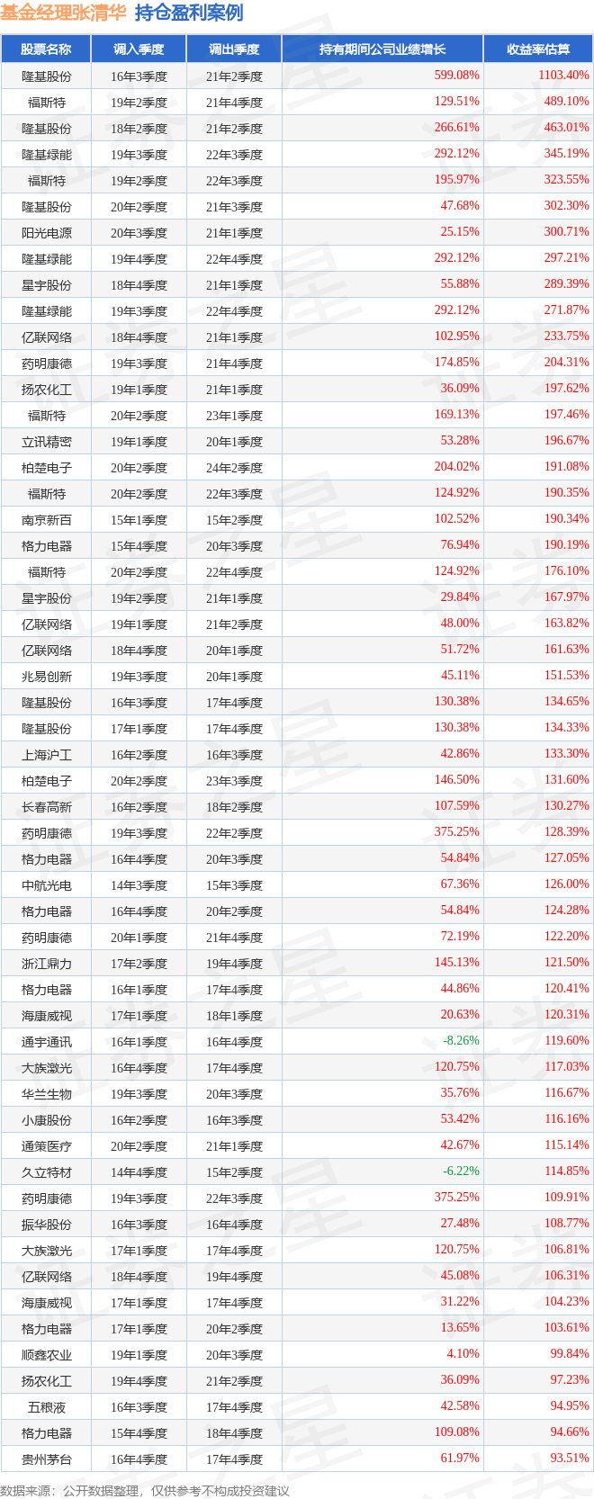张清华管理的易方达安心回馈混合A基金在16年3季度买入隆基股份,在持有4年又3个季度后在21年2季度卖出。持有期间的估算收益率为1103.4%,持有期间隆基股份在2016年到2021年的年报营业总收入增幅达599.08%。