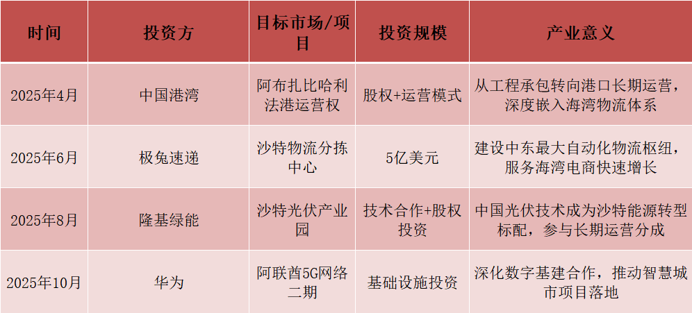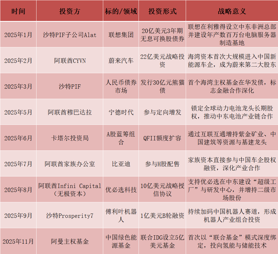2025年,中国与海湾资本合作呈现出“高频化、显性化、战略化”的特征。以下表格梳理了年度内最具代表性的投资事件: