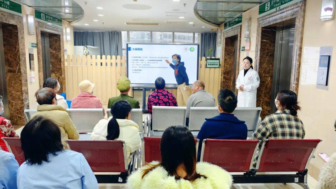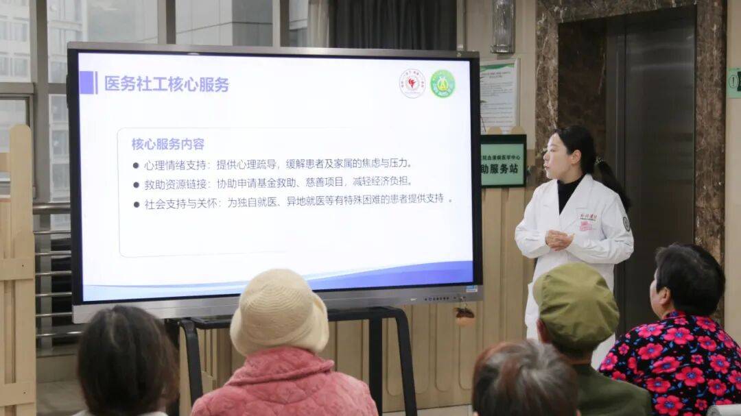 随后,驻科医务社工向在场患者及家属介绍了医务社工服务内容,涵盖心理疏导、资源链接、经济援助申请等多项具体服务,并就经济援助政策以及申请方式展开详细解读。分享过程中,更有经验丰富的患者主动向其他患者及家属补充说明、积极互动,现场掌声连连,洋溢着信任与共鸣。