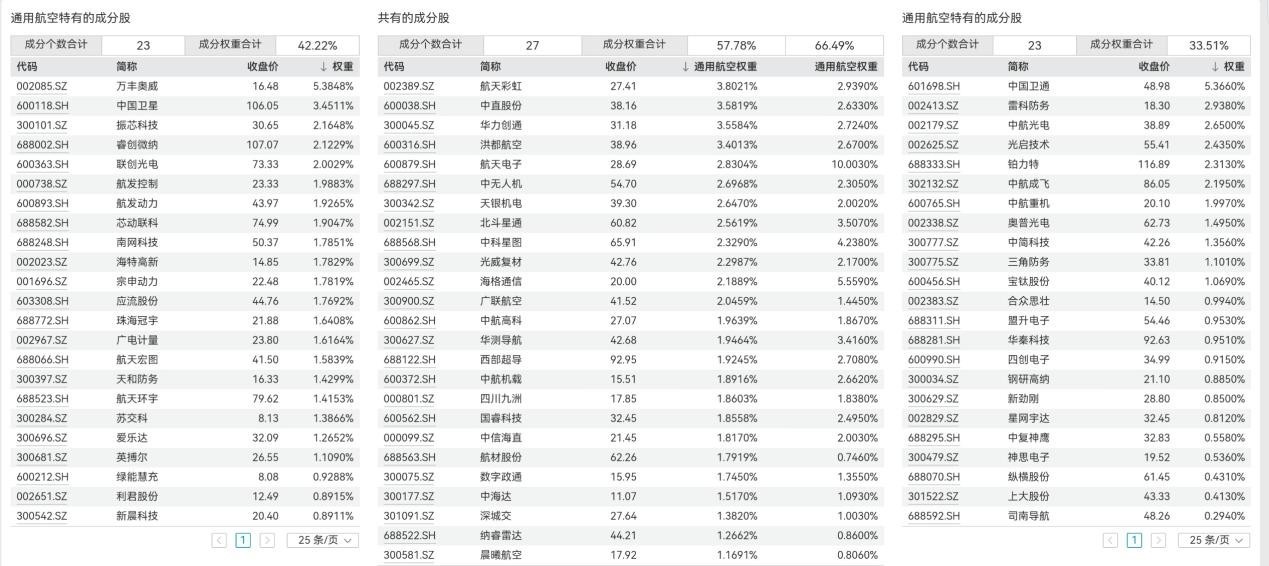 进一步对比两个指数的成分股,可以发现共有的成分股数量是27只,各自独有的成分股都是23只。其中国证通用航空产业指数独有的成分股包括了万丰奥威、中国卫星、振芯科技等,中证通用航空主题指数独有的成分股包括了中国卫通、雷科防务、中航光电等。