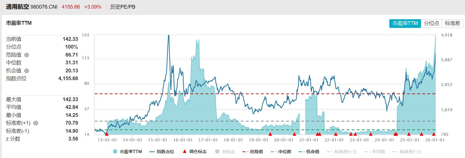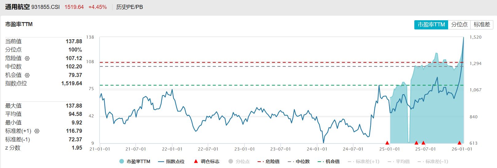 再看两个指数目前的估值水平,Wind数据显示,两个指数目前的市盈率TTM都处在历史100%分位的位置,均是历史高位。不过中证通用航空主题指数过往的统计数据区间较短,主要反映的是近一年来的估值水平。