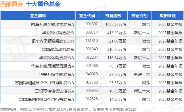 根据2025基金年报公募基金重仓股数据,重仓该股的公募基金共11家,其中持有数量最多的公募基金为前海开源基金的前海开源金银珠宝混合A。前海开源金银珠宝混合A目前规模为9.57亿元,最新净值3.11(3月18日),较上一交易日下跌0.06%,近一年上涨94.01%。该公募基金现任基金经理为吴国清。吴国清在任的基金产品包括:前海开源沪港深核心资源混合A,管理时间为2016年10月17日至今,期间收益率为446.21%;前海开源一带一路混合A,管理时间为2019年7月19日至今,期间收益率为-18.66%;前海开源沪港深农业混合A,管理时间为2020年7月20日至今,期间收益率为-31.64%;