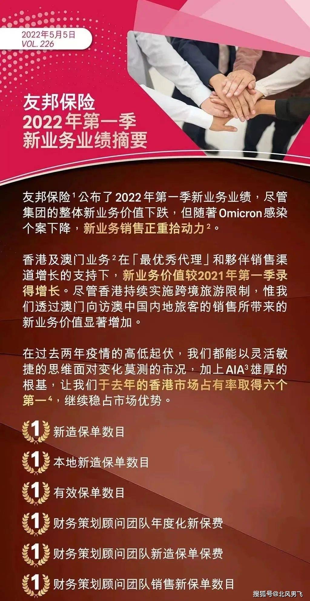 即便是疫情中,友邦保险2022年第一季新业务业绩,相较于2021年有显著增长。同时在去年整年业绩中,友邦在香港市场占有率上强势取得包括新造保单数目、新造保单保费等六个第一。